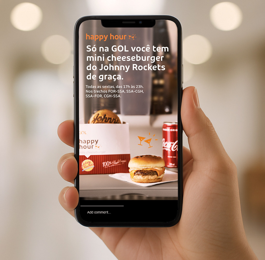 As part of a special onboard service initiative, GOL introduced new limited-time items — a hamburger and the traditional Brazilian pão de queijo — available exclusively on the Rio–São Paulo route. I was responsible for designing the packaging for these products, ensuring they aligned with the airline’s brand and elevated the passenger experience. In addition, I led the art direction for the photoshoot that supplied imagery for the communications and created the final visual materials, guaranteeing cohesive and appealing communications throughout the campaign.